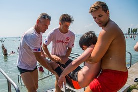 Hangsúlyozta azt is, hogy nemcsak a mély, hanem a sekély víz is életveszélyes lehet. Minden évben történik haláleset vagy maradandó bénulás különböző fürdőeszközökről ugrálás miatt. A közelmúltban Siófokon ugrott 80 centis vízbe egy fiatal, akin már nem tudtak segíteni – mondta. A sekély víz veszélyét a strandon egy vízibicikli mellett kézen álló emberrel is szemléltették a vízimentők.