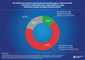 Kevésbé volt megosztott annak kapcsán a magyar társadalom, hogy a miniszterelnök-jelölti előválasztáson induló Karácsony Gergelyt szeretné-e kormányfői pozícióban látni. A megkérdezettek mindösszesen 13 százaléka (1 millió fő) szeretné, ha egyszer Budapest jelenlegi főpolgármestere lenne a kabinet vezetője, 67 százalékuk azonban – 5,4 millió magyar választó – nem szeretné őt ebben a pozícióban látni.