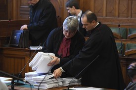 Ügyészek készülődnek elő a Viking Sigyn szállodahajó ukrán kapitányának előkészítő ülésére a Pesti Központi Kerületi Bíróságon 2020. március 11-én.