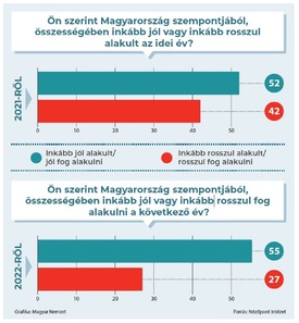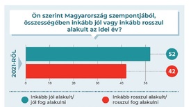 A pozitív visszatekintés jó alap a derűlátó jövőbe tekintéshez – mutat rá a Nézőpont Intézet a kutatáshoz készített elemzésében –, hiszen arra a kérdésre, hogy „Magyarország szempontjából” inkább jól vagy inkább rosszul fog-e alakulni a következő év, 2021 végén a felnőtt magyarok 55 százaléka felelt úgy, hogy „inkább jól fog alakulni”, és csak 27 százaléka bizonyult borúlátónak.