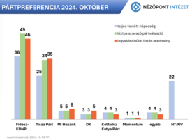 Az Nézőpont Intézet kutatása 2024. október 14. és 17. között, 1000 fő telefonos megkérdezésével készült. A minta reprezentatív a 18 évesnél idősebb lakosságra nem, kor, régió, településtípus és iskolai végzettség szerint. 1000 fős mintanagyság és 95 százalékos megbízhatósági szint esetén a mintavételi hiba ± 3,16 százalék. Az adatok kerekítve lettek egész számra, ezért előfordulhat, hogy összeadott értékük nem pontosan 100.
