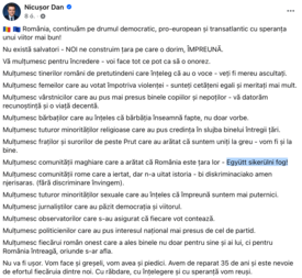 Külön köszönetet mondott a vallási kisebbségeknek, „amelyek a hitet az ország jólétének szolgálatába állították”, és az őt nagy számban támogató moldovai románoknak is. A magyar mellett a roma kisebbségnek is saját nyelvén üzent – „nem lesz diszkrimináció, és győzünk” – írta -, és a szexuális kisebbségeknek is megköszönte a támogatást.