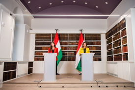 Szentkirályi Alexandra kormányszóvivő (b) és Kupecki Nóra, az Igazságügyi Minisztérium alkotmányjogi jogalkotásért és fogyasztóvédelemért felelős helyettes államtitkára sajtótájékoztatót tart az Igazságügyi Minisztériumban 2023. február 3-án