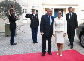 Párizs, 2022. november 11. Novák Katalin köztársasági elnököt (j) fogadja Gérard Larcher, a francia szenátus elnöke (b) Párizsban 2022. november 11-én.