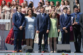 Budapest, 2022. május 14. Novák Katalin köztársasági elnök (b2) a beiktatási díszceremóniáján családja körében az Országház elõtt, Kossuth téren 2022. május 14-én. Az államfõ mellett férje, Veres István (b3).
