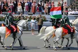 Budapest, 2022. május 14. Huszárok Novák Katalin köztársasági elnök (k) beiktatási díszceremóniáján az Országház elõtt, a Kossuth téren 2022. május 14-én. Az államfõ mellett Kun Szabó István vezérõrnagy, a Köztársasági Elnöki Hivatal Honvédelmi Irodájának vezetõje, az államfõ fõhadsegédje (b) és Ruszin-Szendi Romulusz altábornagy, a Magyar Honvédség parancsnoka (j).