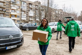 Novák Katalin köztársasági elnökjelölt, a Magyar Református Szeretetszolgálat jószolgálati nagykövete segélycsomagot visz egy helyi sokgyermekes családnak a kárpátaljai Beregszászban 2022. március 4-én