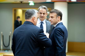 Orbán Viktor miniszterelnök (b) és Emmanuel Macron francia köztársasági elnök (j) az Európai Unió tagországai állam- és kormányfõinek kétnapos tanácskozásán Brüsszelben 2023. december 14-én. Középen Kiriákosz Micotakisz görög miniszterelnök.