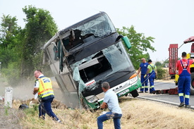 Oldalára borult egy ukrán turistabusz Kunszentmártonban