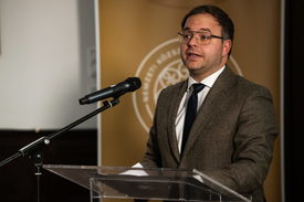 Orbán Balázs, a miniszterelnök politikai igazgatója beszédet mond a Nemzeti Közszolgálati Egyetem Stratégiai Tanulmányok Intézetének John Lukacs és az amerikai konzervativizmus című pódiumbeszélgetésén az egyetem John Lukacs termében 2022. november 21-én