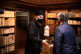 Budapest, 2020. december 18. A Miniszterelnöki Sajtóiroda által közreadott képen Orbán Viktor miniszterelnök (j) és Kocsis Fülöp, a Hajdúdorogi Fõegyházmegye érsek-metropolitája, görögkatolikus püspök találkozójukon a Karmelita kolostorban 2020. december 18-án. Orbán Viktor kormányfõ ezen a napon délután a Karmelita kolostorban vendégül látta a Magyar Görögkatolikus Egyházmegyék vezetõit, akik átadták a betlehemi békelángot hordozó lámpást a miniszterelnöknek.