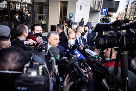 Orbán Viktor miniszterelnök (k) nyilatkozik a sajtónak az európai konzervatív pártvezetõk találkozóján Madridban 2022. január 29-én. A magyar kormányfõ mögött balra Havasi Bertalan, a Miniszterelnöki Sajtóiroda vezetõje.
