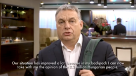 A kormányfő – a Facebook-oldalán közzétett videóban – azt mondta, „a helyzetünk sokat javult, mert itt vihetem a hátizsákomban annak a kétmillió-háromszázezer magyar embernek a véleményét, aki világossá tette, nem kíván Soros-tervet és nem támogatja, hogy Brüsszel ilyen terveket hajtson végre”.