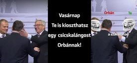 A kampányfilmben pedig azt a bejátszást láthatjuk, amelyen az isiászos Jean-Claude Juncker egy alkalommal megpaskolta Orbán Viktor arcát Donald Tusk társaságában.