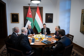 Budapest, 2025. október 16. A Miniszterelnöki Kommunikációs Fõosztály által közreadott képen Orbán Viktor miniszterelnök (j2) fogadja II. Abdalláh jordán királyt (b) a Karmelita kolostorban 2025. október 16-án. A kormányfõ mellett Szijjártó Péter külgazdasági és külügyminiszter (j3). MTI/Miniszterelnöki Kommunikációs Fõosztály/Fischer Zoltán
