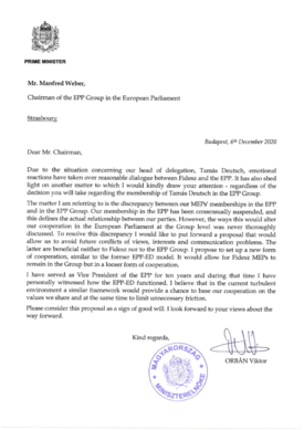Orbán Viktor a Fidesz elnökeként az Európai Néppárt és az Európai Demokraták (EPP–ED) egykori EP-képviselőcsoport mintájára tett együttműködési javaslatot Manfred Webernek, a néppárt európai parlamenti frakcióvezetőjének – írja a Magyar Nemzet.A miniszterelnök a vasárnapi keltezésű dokumentumban azzal érvel, hogy Deutsch Tamásnak, a Fidesz–KDNP néppárti delegációvezetőjének esetleges kizárása nyomán erős indulatok uralkodtak el, így beszélni kell arról, hogy a magyar kormánypárt miképp működik tovább az európai parlamenti frakcióban.