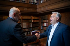 Orbán Viktor miniszterelnök (j) fogadja Kelemen Hunort, a Romániai Magyar Demokrata Szövetség (RMDSZ) elnökét (b) a Karmelita kolostorban 2025. május 19-én