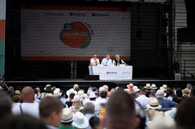 Orbán Viktor kormányfõ (k) elõadást tart a 32. Bálványosi Nyári Szabadegyetem és Diáktáborban az erdélyi Tusnádfürdõn 2023. július 22-én. Mellette Németh Zsolt, az Országgyûlés külügyi bizottságának fideszes elnöke (b) és Tõkés László, az Erdélyi Magyar Nemzeti Tanács (EMNT) elnöke (j).