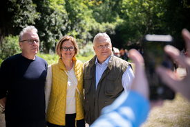 Orbán Viktor kormányfõ, a Fidesz elnöke (j) Fonti Krisztina, a XII. kerület alpolgármestere, a Fidesz-KDNP polgármesterjelöltje (k) és Pokorni Zoltán (Fidesz-KDNP) polgármester (b) társaságában budapesti kampánykörútján az 58-as villamos régi végállomásánál 2024. április 27-én.