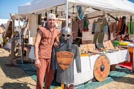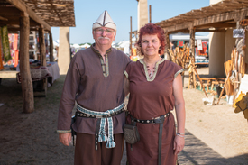 A kirakodóvásár egyik kis „utcájában” találkozunk a Tolna vármegyei Rózsával és Lászlóval, akik saját készítésű, honfoglalás korabeli, finoman díszített lenvászon öltözetben mustrálják az árut. A középkorú házaspár először 2018-ban vett részt az Ősök Napja ünnepen, azóta törzsvendéggé váltak.
