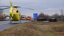 Az MTI helyszínről származó információi szerint szombat délelőtt egy Szeged felé haladó, trélert vontató, román rendszámú kisbusz letért a sztrádáról és az árokba borult; a kisbusz és a vontatott jármű is az oldalán állt meg. A járműben heten utaztak.