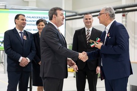 Palkovics László innovációs és technológiai miniszter (k) jelképesen átadja az intézmény kulcsát Nagy Andrásnak, a ZDÁK Nonprofit Kft. ügyvezetőjének (j) a Zalaegerszegi Duális Ágazati Képzőközpont átadásán 2022. március 12-én. Mögöttük Vigh László fideszes országgyűlési képviselő (b), Pölöskei Gáborné szakképzésért felelős helyettes államtitkár (b2) és Balaicz Zoltán (Fidesz-KDNP) polgármester (j2)