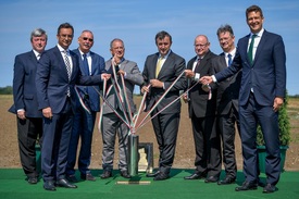 Pósán László fideszes országgyűlési képviselő, Papp László (Fidesz-KDNP) polgármester, Szilvássy Zoltán, a Debreceni Egyetem rektora, Kósa Lajos fideszes országgyűlési képviselő, Palkovics László innovációs és technológiai miniszter, Kossa György, a Gróf Tisza István Debreceni Egyetemért Alapítvány elnöke, Bács Zoltán, a Debreceni Egyetem kancellárja és György László, az Innovációs és Technológiai Minisztérium (ITM) gazdaságstratégiáért és szabályozásért felelős államtitkára (b-j) a Debrecenben épülő nemzeti oltóanyaggyár alapkőletételén 2021. szeptember 5-én