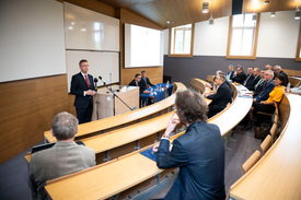 Hankó Balázs, a Kulturális és Innovációs Minisztérium innovációért és felsőoktatásért felelős államtitkára beszédet mond az egyetemeknek meghirdetett 340 milliárd forintnyi pályázat részleteiről tartott sajtótájékoztatón az Óbudai Egyetem székesfehérvári campusán 2024. május 2-án