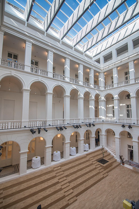 A legmeglepőbb változáson talán mégis a belső udvar esett át: az üvegtetővel fedett átrium világos, elegáns térré változott. Földszintjének lépcsőzetes megoldása nemcsak praktikum, hanem adottság, az épület Fő utcai oldala ugyanis alacsonyabban áll. A tervező tényleg mindenre gondolt, így hangelnyelő burkolattal látta el a teret, ami nem engedi, hogy a hangok összevissza verődjenek a falakon és a tető üvegfelületén, a helyiség koncertek és táncházak megtartására ideális. Itt, az átriumban ültették el a Kárpát-medence élő népművészetét jelképező hagyományok fáját is, így mindez szimbolikus térré nemesedett.