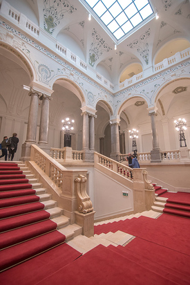 A neoreneszánsz épület fényárban úszó lépcsőházában érvényesül leginkább a korai szecesszió: a zöldes-okkeres-fáradt vörös indák, levél- és stilizált virágmotívumok folyondárjai elegánsan idézik meg a századfordulón egyre divatosabbá váló díszítőművészetet. Sőt, mintha az épület mai rendeltetését szimbolizálnák, pávadíszítések sorakoznak a falon.