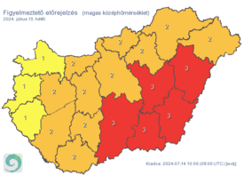 A meteorológiai szolgálat az MTI-hez vasárnap eljuttatott veszélyjelzésében arról tájékoztatott: hétfő éjfélig Bács-Kiskun, Békés, Csongrád-Csanád, Hajdú-Bihar és Jász-Nagykun-Szolnok vármegyék területére adtak ki a hőség miatt piros fokozatú figyelmeztetést. Az érintett vármegyékben a napi középhőmérséklet 29 Celsius-fok felett alakulhat.