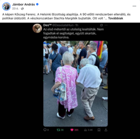 A nemrég a 2026-os jelöltségtől visszalépő fővárosi képviselő, Jámbor András tett közzé a hétvégén egy képet a pride-on vonuló Kőszeg Ferencről – számolt be a Magyar Nemzet.