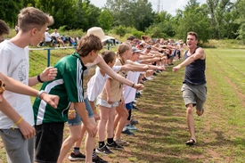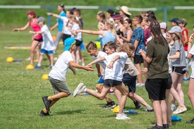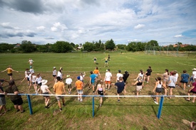 A templomból a szobi sportpályára megyünk, ahol a gyerekek csapatokba verődve ügyességi akadályversenyen mérik össze tudásukat.