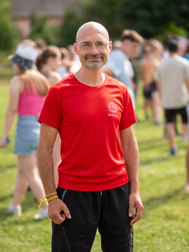 Megérkezik a sportpályára a barátságos habitusú, közvetlen stílusú Hiba György atya, a budapesti Xavéri Szent Ferenc jezsuita rendház szerzetese is, hogy a miseruhát tornacipőre és piros pólóra váltva a nap hátralévő részét a gyerekekkel töltse.