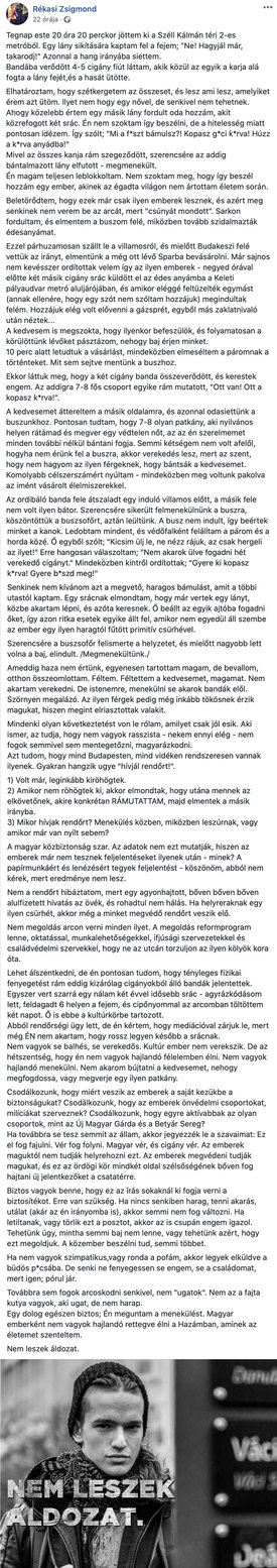 Rékasi Zsigmond – bejegyzése alapján – hétfő este a Széll Kálmán téren hajtott végre hőstettet, amikor néhány – állítása szerint – cigány fiú közrefogott egy lányt és nem eresztették. Ezután kissé zavaros a történet, elvileg egy két fiúból és egy lányból álló másik banda is jelen volt, akik Zsebit kopasz k*rvának nevezték. A lány, akit nem eresztettek, megmenekült, ám az új célpont a hős és „kedvese” lettek.