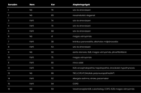 A koronavirus.gov.hu/elhunytak címen elérhető táblázatból kiderül, hogy egy nyolcvan esztendős korában elhunyt férfit kivéve valamennyi betegnek volt ismert alapbetegsége, volt, amelyiküknek több is.