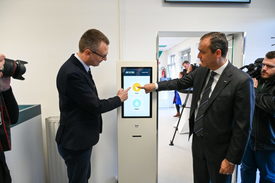 Rétvári Bence, a Belügyminisztérium parlamenti államtitkára, KDNP-s országgyűlési képviselő (b) és Mátrai Károly, az MVM csoport vezérigazgatója az MVM Energetika Zártkörűen Működő Részvénytársaság (MVM Zrt.) megújult váci ügyfélszolgálati irodájának megnyitóján 2025. február 21-én