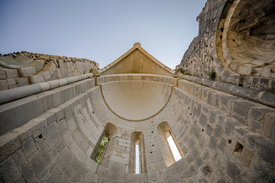 A Sedlmayr János építész rekonstrukciós tervei alapján visszaépült nyugati kapun lépünk be a bazilika egykor hatalmas belső terébe, melynek nyolcszögű pilléreit valamikor sárkányok és szörnyalakok díszítették. A félköríves alaprajzú főszentély falai ugyan a XX. századra az ablakok magasságáig elpusztultak, ám az apszis félkupoláját, az ablakok záradékát és a szentélyboltozat egy szakaszát szintén Sedlmayrnek köszönhetően visszaépítették, csakúgy mint a kolostorkerengőre vezető északi kapuzatot.