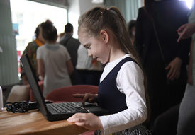 Egy kislány nézi a Nõk Magyarországért Klubtól kapott ajándék laptopját Budapesten az Egyszülõs Központban 2020. május 27-én.