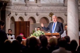 Semjén Zsolt miniszterelnök-helyettes beszédet mond a Gál Ferenc Egyetem központi tanévnyitóján a Szegedi Dómban 2022. szeptember 14-én