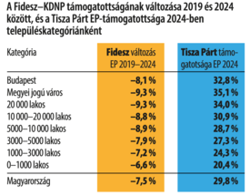 Felhívta a figyelmet arra, hogy a Fidesz 2022-hez képest mindegyik településkategóriában veszített szavazatot: támogatottsága a falvakban két évvel ezelőtt 62 százalék volt, míg idén 54, és a kisvárosokban is hasonló a visszaesés. Hozzátette, míg két évvel ezelőtt az ellenzék a falvakban 26, a kisvárosokban 32 százalékot ért el, idén drámai visszaesés történt a baloldalon: falun 10, a kisvárosokban pedig 11 százalékot értek el. Kérdésünkre, miszerint a kormánypártok szavazatvesztése átszavazás vagy otthon maradás miatt következett-e be, úgy válaszolt, hogy az adatokból ezt nem lehet egyértelműen megállapítani, ehhez speciális kutatásra volna szükség, amely az átszavazásokat vizsgálja.