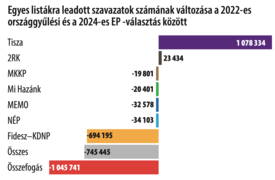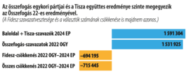 A magát függetlennek mondó, de az ellenzékhez közel álló Átlátszó nevű portál a Csalódott ellenzékieket sodor a Tisza című, vármegyékre koncentráló elemzésében azt állítja, a választási adatokból egyértelműen levezethető, hogy az összefogás egykori pártjai és a Tisza együttes eredménye szinte megegyezik a baloldali összefogás 2022-es teljesítményével (3. ábra). Ugyanilyen lényeges megállapítás, hogy a Fidesz szavazatveszteségének csökkenése szoros összefüggést mutat a részvétel csökkenésével, ugyanis a Fidesz 694 ezerrel kapott kevesebb listás szavazatot, mint a két évvel ezelőtti országgyűlési választásokon, az összes szavazatcsökkenés pedig 715 ezer (4. ábra).