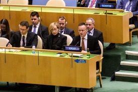 A Külgazdasági és Külügyminisztérium közleménye szerint a tárcavezető az ENSZ-közgyűlés ülésén mindenekelőtt azt hangsúlyozta, hogy a második világháború óta napjainkban van legrosszabb állapotában a globális biztonság, soha nem volt még ekkora a veszélye a harmadik világháború kitörésének, ezért a világszervezetnek az élére kell állnia minden terrorellenes és béketörekvésnek.
