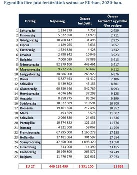 Míg Magyarországon egymillió lakosra vetítve 6512 pozitív eset volt, addig az Európai Unió átlaga 11868 volt. A legrosszabbul Belgium teljesít, ahol egymillió lakosra több mint 27 ezer fertőzött jut.