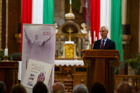 Hozzáfűzte: Szent II. János Pál pápa bízott abban, hogy a népek, nemzeti közösségek egymás mellett tudnak élni, nem pusztítják, hanem segítik egymást, ma mégis vannak a világban, akik gyűlölettel fordulnak mindazon értékek felé, amelyeket a katolikus egyházfő képviselt. Soltész Miklós köszöntőjében utalt arra, hogy amikor a magyar kormány megbízásából Lengyelországban arról tárgyalt, miként támogatná hazánk egy Krakkóban felállítandó, Szent II. János Pál pápáról készülő szobor felállítását, Varsóban éppen akkor gyalázták meg, takarták le szivárványszínű zászlóval a szobrát.