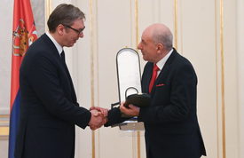 A Magyar Érdemrend nagykeresztje a nyaklánccal és az arany sugaras csillaggal kitüntetést adta át Sulyok Tamás köztársasági elnök hétfőn Aleksandar Vucicnak, a Szerb Köztársaság államfőjének.