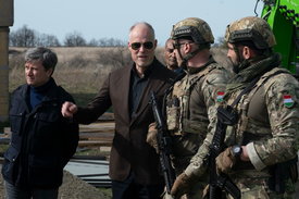 Pavel Stanchev, a TV2 Csoport vezérigazgatója, Szalay-Bobrovniczky Kristóf honvédelmi miniszter, Pálinkás Szilveszter katonai szakértő és Csórics Balázs színművész, főszereplő a S.E.R.E.G. című, a Megafilm Service Kft. által forgatott, a TV2-n ősszel debütáló sorozat médianapján az újdörögdi romvárosban 2024. március 26-án