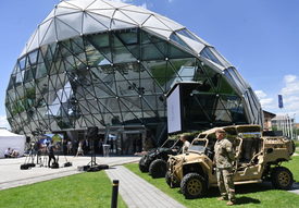 Katonák és katonai járművek a központi toborzó iroda és a haditechnikai show-room megnyitója előtt a Bálna Honvédelmi Központnál 2024. június 17-én