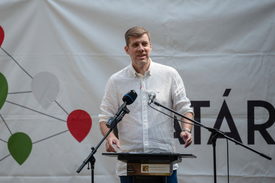 Szilágyi Péter, a Miniszterelnökség nemzetpolitikáért felelős helyettes államtitkára beszédet mond az anyaországi és külhoni fiatalok részvételével rendezett III. Honfoglaló tábor megnyitóján Noszvajon 2023. augusztus 23-án