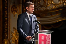 Szilágyi Péter, a Miniszterelnökség nemzetpolitikáért felelős helyettes államtitkára beszédet mond a Szent László Napok megnyitóján a nagyváradi Szigligeti Színházban 2023. június 19-én